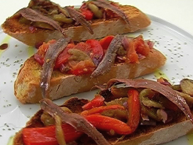 Горячая закуска с запеченными овощами.Состав:лук — 1 штука;баклажан — 1 штука;перец — 1 штука;анчоусы в масле — 6 штук;помидоры — 3 штуки;чеснок — 1 зубчик;чабатта — 3 кусочка;оливковое масло, вишневый уксус, соль, тмин — по вкусу.